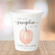 Cute gender-neutral paper cups for your fall baby shower featuring "A Sweet Little Pumpkin Is On Its Way" written in simple grey typography and stylish script with swashes, and a cute pastel orange pumpkin watercolor. Specify the baby’s gender if desired (e.g., "is on his way").