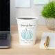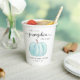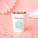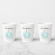 Cute paper cups for your fall baby boy shower featuring "A Sweet Little Pumpkin Is On His Way" written in simple grey typography and stylish script with swashes, and a cute pastel blue pumpkin watercolor.
