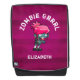 A backpack with attitude. Designed with a cute zombie girl illustration with hot pink hair and deathly green skin. Wearing punk rock themed attire. Her arms outstretched searching for brrraaaains. Curved text says: Zombie Grrrl with a personalised name beneath. Set on a background which is a deep magenta colour with a grunge look.