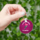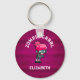 A keychain with a cute zombie girl illustration with hot pink hair and deathly green skin. Wearing punk rock themed attire. Her arms outstretched searching for brrraaaains. Curved text says: Zombie Grrrl with a personalised name beneath. Set on a background which is a deep magenta colour with a grunge look.