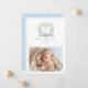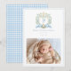 This sweet baby announcement is a perfect way to announce the arrival of your new baby. The design features a monogram crest with a blue ribbon and a cute puppy. Introduce your baby with the details of your new baby's special day and a newborn photo. The back of the announcement has a blue gingham pattern.