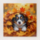 A cute puppy dog Autumn themed puzzle A sweet little puppy dog playing in a pile of Autumn leaves. He's peeking out adorably as he hides in the pile of leaves.