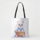 An adorable fluffy puppy sitting in a basket wearing a cute blue outfit. A soft and charming design perfect for dog lovers and kawaii fans.