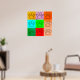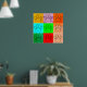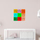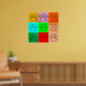Wall art with acute pattern of black dog paw prints in squares of different colours.
