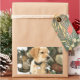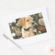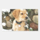cute yellow golden retriever playing in the snow against field stone wall with ivy