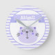 NewParkLane - Personalised clock, with a template for your name in a lilac banner, and a cute cat in different shades of purple. In the background a sweet lavender and white striped pattern. A cute design for a nursery or kids' room!