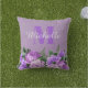Cute and girly purple vintage floral and silver glitter custom outdoor decorator pillow. Personalised with your monogram/initial and your first name in an elegant script font. Perfect for decorating your porch or patio furniture.
