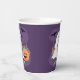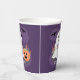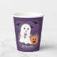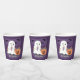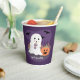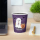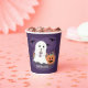 Here is an adorable purple paper cup for your Halloween party with a sweet little ghost sipping on a cold pumpkin spice latte . He is standing next to a cute jack-o-lantern and a few bats are flying behind him . Personalise it with your own text . (It can be a Halloween message , a family or company name ). Look for the matching paper cups and napkins .
