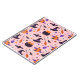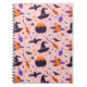 This design showcases a whimsical and vibrant Halloween pattern with a playful colour scheme. The design features a soft pink background, adorned with an array of classic Halloween icons. Among them are witch hats, cauldrons bubbling with potions, flying bats, skulls, broomsticks, and bottles of potion. There are also elements like mushrooms, stars, crescent moons, and clouds, all rendered in a palette of rich purples, oranges, and blacks. The overall effect is a fun and festive pattern that captures the spooky yet lighthearted spirit of Halloween, perfect for decorations, costumes, or party supplies.