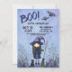 The design features a sweet little witch in purple stripes with her black cat and friendly bats flying above. A whimsical blue and purple background with stars sets the scene for a fun and festive afternoon. Perfect for children’s costume parties.