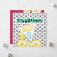 With four cartoon, crazy eyed chickens, on a black and white chicken foot print background in front and another four crazy chickens peeking-in, on a pink background on the back, this one is just so much fun!