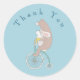 A cute thank you sticker with a touch of whimsy. This whimsical illustration shows a long-eared white bunny, wearing yellow pants, sitting on the handlebars of a old fashioned vintage bicycle (big front wheel and small back wheel). The bike is pedalled by a big brown bear with white spots on his back. Adorable and cute.