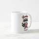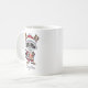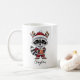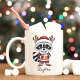 Cute racoon in Christmas pyjamas and Santa hat holding cocoa. This mug is personalised. A great holiday mug for kids on Christmas morning cocoa.