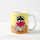Cartoon racoon eating watermelon wildlife art on mugs with a background colour that can be customised