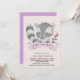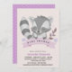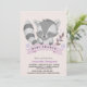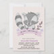 Cute Racoon Baby Shower Invitation. Back of invitation is purple with white dots and has flowers around banner. Customise with your shower details using our easy template.