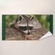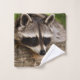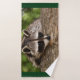 Towel set with a photograph of a cute and curious racoon resting his face on a wooden log. Adorable.