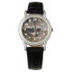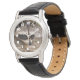A watch with a photograph of a cute and curious racoon resting his face on a wooden log. Adorable.