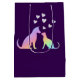 Celebrate the bond between pets with this adorable purple medium gift bag featuring a vibrant rainbow gradient silhouette of a cat and dog. Surrounded by colorful floating hearts, this "Love in the Air" design is the perfect gift for pet lovers, veterinarians, or anyone who treasures their furry friends. Durable and stylish for shopping or daily use.