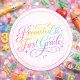 A cheerful rainbow design featuring playful script, hearts, and sparkles to celebrate the milestone of moving into first grade.