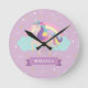Personalised magical rainbow unicorn kids round acrylic wall clock. Girly, cute and fun.