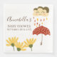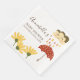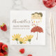 This charming custom baby shower napkin features a cute illustrated theme in warm and cosy, Autumn colours. A cute, happy little raincloud is pictured at the top, raining above a red and yellow polka dot umbrella. The raindrops from the rain cloud are pictured in shades of yellow, brown, orange, and maroon red. A little garden of yellow daisies is pictured along the bottom. The theme is perfect for a Fall baby shower, or gender neutral baby shower during any season.