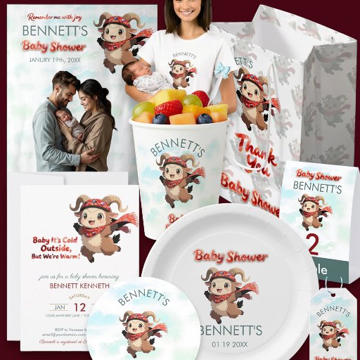 This round sticker is special for its charming, cartoon ram character set against a full-coverage watercolor cloud background. The ram, dressed in a cozy red scarf and hat, perfectly matches the overall "Baby It's Cold Outside" theme. The coordinated and personalized design makes it a whimsical and festive seal for envelopes or an accent for favors at a winter baby shower.