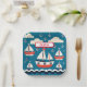 Personalised cute red and white sailboat at sea with anchors and clouds in a beautiful blue background.