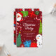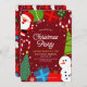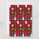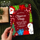 Invite guests to your Christmas party with this cute red holiday invitation featuring Santa Claus, snowman, presents, candy canes, Christmas trees, ornaments, a snowy border frame & a cute pattern on the back.