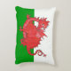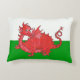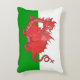 An Accent Pillow or Cushion, with a cute red dragon on a green and white background, similar to the Welsh national flag; from a hand-painted whimsical illustration by Judy Adamson.