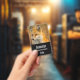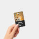 A name tag with a beautiful photograph of a red fox in autumn. Standing in the wilderness among the brush.