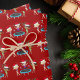 This beautiful gymnastics Christmas wrapping paper features 3 cute gymnast girls wearing Santa hats and holding a pose with ribbons on a pretty red holiday background. The blonde is holding a red ribbon, the brunette is jumping on a trampoline, and the African American girl is holding a green ribbon.