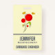 Name tag with a charming drawing of several whimsical red flowers with fat hearts attached to a green stem. 2 yellow butterflies hovering nearby. Sketched with a black outline. Whimsical and cute design.