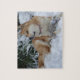 The name of this cute Japanese akita is on this cool jigsawpuzzle is named Asia, she is a red tweeny akita, part American type akita and part Japanese type akita. Asia is a rescue dog and this was her first winter and her first snow with us. She looks very content sitting in the freshly fallen snow with her favourite grey mouse toy resting on her paws. This snow akita picture has a nice relaxed feel to the it as the akita dog happily rests in the deep seasonal snow. This cute dog photo makes a great jigsaw, it will be a special gift for everyone who loves cute dogs and the akita breed.