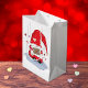 A white gift bag with an adorable red gnome holding a letter . Perfect for Valentine's Day , anniversaries , birthdays or baby showers . Also available in pink and blue-grey .