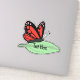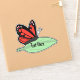 A colorful and cute sticker featuring a red monarch butterfly sitting on a leaf. A great way to label your personal items.