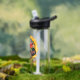 Here's a cute personalised water bottle that any little boy would love. A red monster truck with big tires goes through a ring of orange flames. His name is in red at the bottom left of the image. *Graphic design credit to Prettygrafik Design, © Prettygrafik.com.