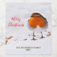 A traditional winter and Christmas theme for Your Christmas, Holiday party and dinner.  A cute red Robin coming to a garden, backyard for the sunflower seeds lying in the snow. White background (the snow) Colours of the nature: Orange, brown and white. With the text: Merry Christmas written with a modern hand lettered style script. Template for your family name and year. Red and green text.
