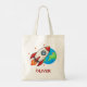 This personalised boys' tote bag features a cute red space rocket firing its engine in space above Earth.