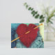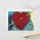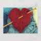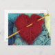 Beautiful photograph of a heart made of burgundy coloured wool on a background of assorted blues. I pierced a knitting needle through it Like an arrow through your heart! A cute and quirky take on love and romance!