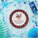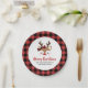 Cute rustic Christmas party paper plates with a cute reindeer with a big red nose, lashes, and a plaid bow in her antlers. Red buffalo check trim. Add your family name!