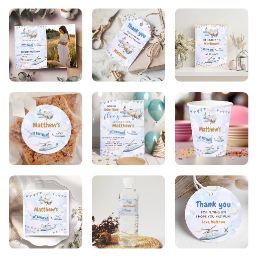 Cute Retro Blue Aeroplane 1st Birthday Photo Thank You Card