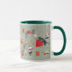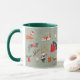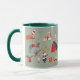 Cute retro Christmas illustration with cats around the Christmas tree, looking presents, all-over print pattern on green background. Original artwork by Caroline Bonne Müller