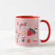 Cute retro Christmas illustration with cats around the Christmas tree, looking presents, all-over print pattern on pink background. Original artwork by Caroline Bonne Müller
