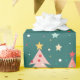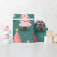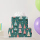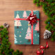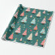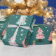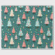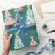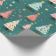 Fun colours decorate cute little Christmas trees that parade over this light-hearted wrapping paper. A dark teal blue green background rests behind the colourful festive trees in pink, light blue, and with yellow stars and multicolored baubles. These are from a retro watercolor pattern.