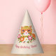 These cute girls' birthday party hats feature a hand drawn retro cat wearing sunglasses, along with floral elements (including daisies) and star accents. A colour palette of pink, orange, muted gold, and olive toned greens adds to the retro / vintage look! A text template is included for easy personalisation. *Illustration by Tracey Khalei / Orabella Prints.