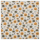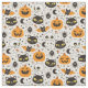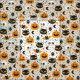 This design presents a cute and whimsical Halloween pattern filled with a delightful assortment of classic spooky icons. The background is a light cream colour, providing a soft contrast to the bold designs. The pattern includes playful jack-o'-lanterns with different expressions, black cats with bright yellow eyes, smiling skulls, and friendly bats with orange wings. Scattered throughout are spiders, crescent moons, stars, mushrooms, and magical symbols, all adding to the enchanting Halloween atmosphere. The colour palette features striking blacks, oranges, and yellows, creating a lively and festive design perfect for Halloween decorations, clothing, or party themes. The overall feel is fun and charming, ideal for celebrating the spooky season with a touch of sweetness.