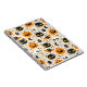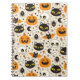 This design presents a cute and whimsical Halloween pattern filled with a delightful assortment of classic spooky icons. The background is a light cream colour, providing a soft contrast to the bold designs. The pattern includes playful jack-o'-lanterns with different expressions, black cats with bright yellow eyes, smiling skulls, and friendly bats with orange wings. Scattered throughout are spiders, crescent moons, stars, mushrooms, and magical symbols, all adding to the enchanting Halloween atmosphere. The colour palette features striking blacks, oranges, and yellows, creating a lively and festive design perfect for Halloween decorations, clothing, or party themes. The overall feel is fun and charming, ideal for celebrating the spooky season with a touch of sweetness.