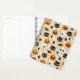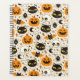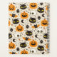 This design presents a cute and whimsical Halloween pattern filled with a delightful assortment of classic spooky icons. The background is a light cream colour, providing a soft contrast to the bold designs. The pattern includes playful jack-o'-lanterns with different expressions, black cats with bright yellow eyes, smiling skulls, and friendly bats with orange wings. Scattered throughout are spiders, crescent moons, stars, mushrooms, and magical symbols, all adding to the enchanting Halloween atmosphere. The colour palette features striking blacks, oranges, and yellows, creating a lively and festive design perfect for Halloween decorations, clothing, or party themes. The overall feel is fun and charming, ideal for celebrating the spooky season with a touch of sweetness.