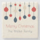 Cute retro Merry Christmas coaster with vintage 70 style ornaments in red, blue, and ivory above your family name. Beautiful nostalgic holiday decor gift for your home.
