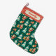 A cute Christmas stocking with a retro mid century vibe pattern of cute Santas. Red & green holly on the top with room for a custom name or greeting. The back features the same cute Santas and holly. Perfect for gift giving or decorating your hearth so it's ready for Santa.